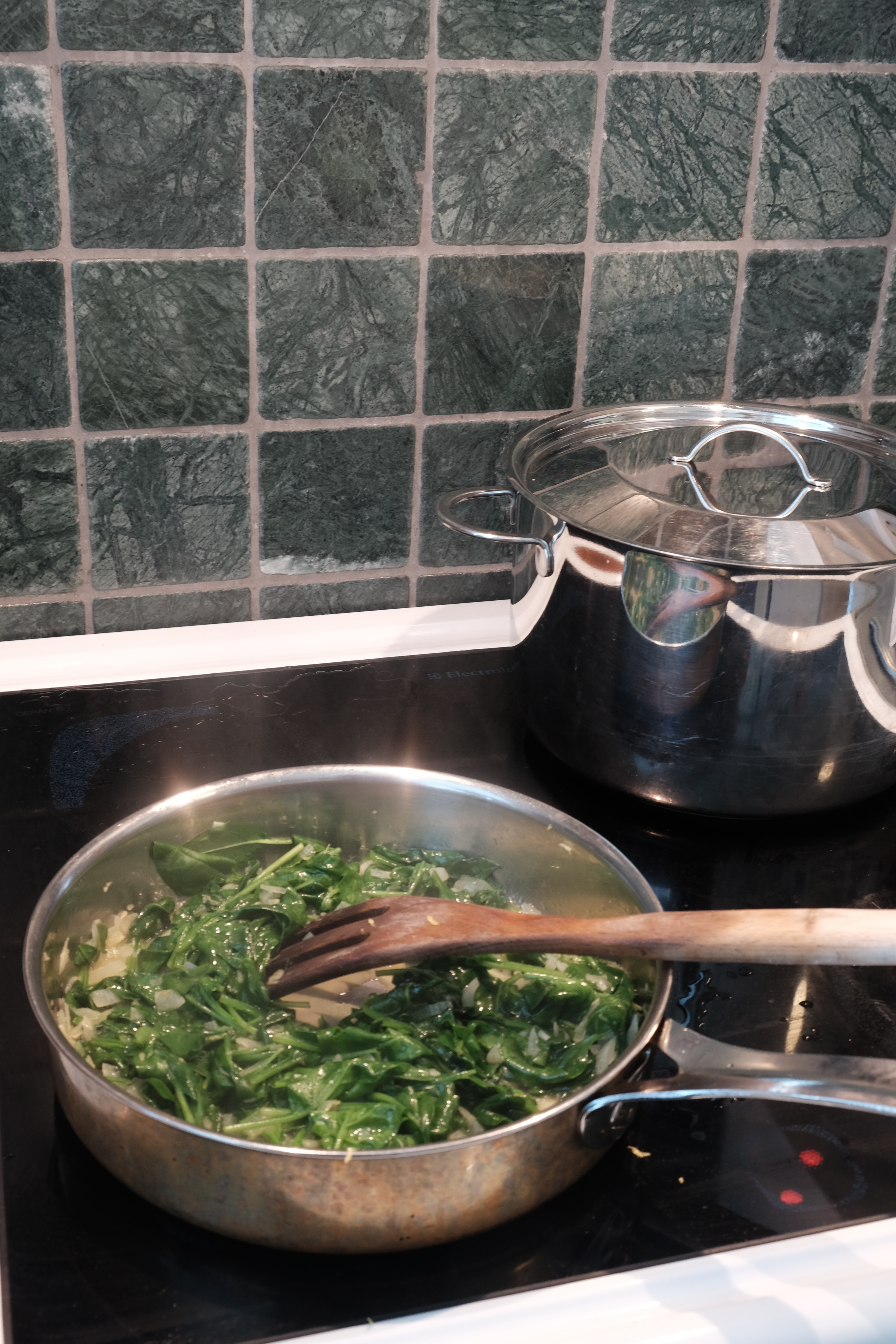 Start by chopping onion and garlic quite fine, then add to a saucepan with a good amount of olive oil and sauté until translucent (approximately 5 minutes). Add the spinach and lemon zest and cook for a couple more minutes until the spinach has reduced down as shown in the picture below. Meanwhile you can boil your choice of pasta but make sure you cook it al dente!