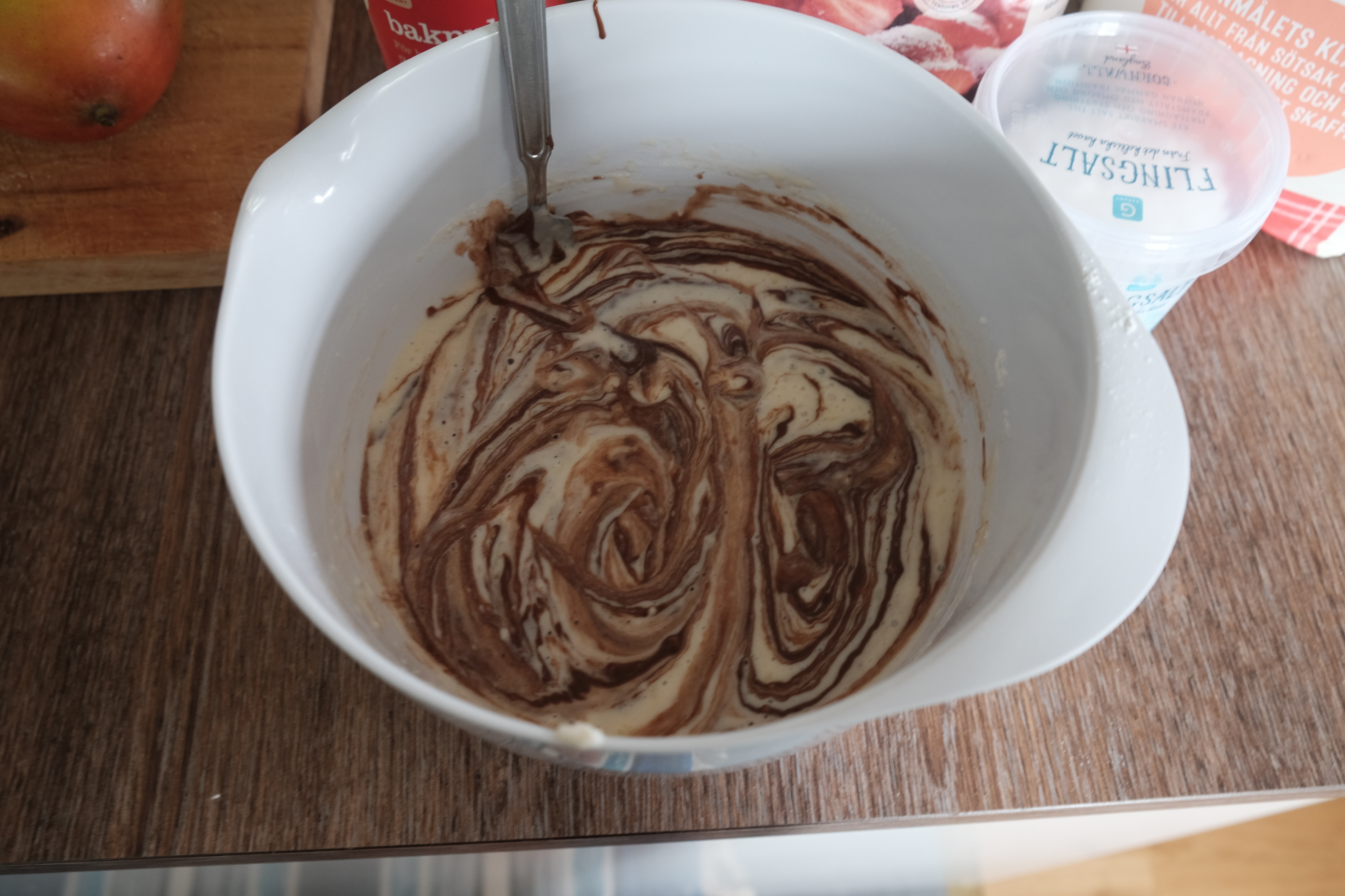 In a large bowl, sift in the flour and then mix it with baking powder, salt and sugar. Make a well in the middle of the dry ingredients and pour in your milk, egg and melted butter. Mix until just combined, don’t over-mix! Add your nutella in little dollops and mix until you get a ripple effect (see below).