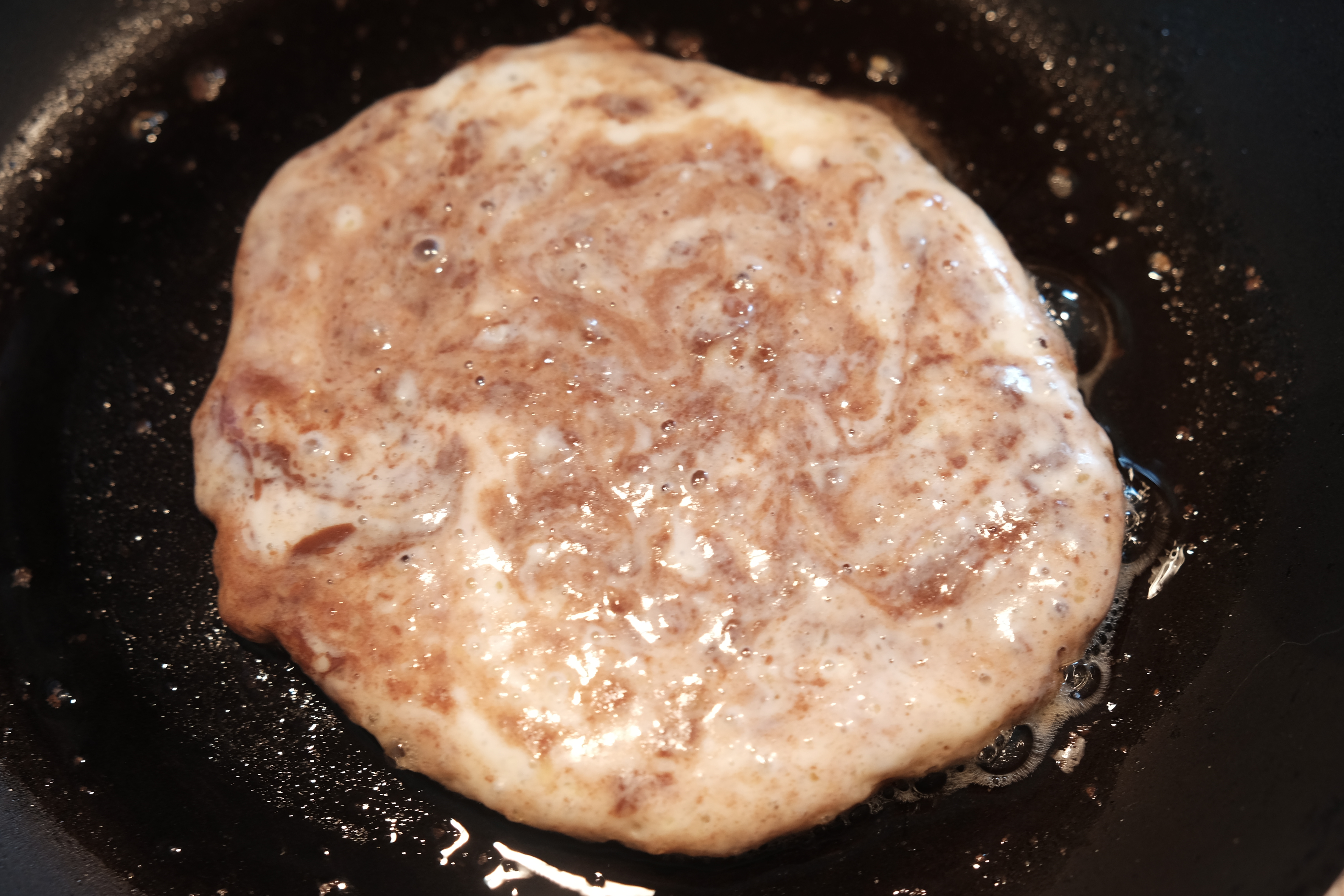 Heat a frying pan over medium heat and add butter or rapeseed oil. Scoop in your batter, about 1/4 of a cup per pancake. Fry the pancake until little bubbles start to appear on the top of the pancake and then flip and brown the other side of it for a minute or two.