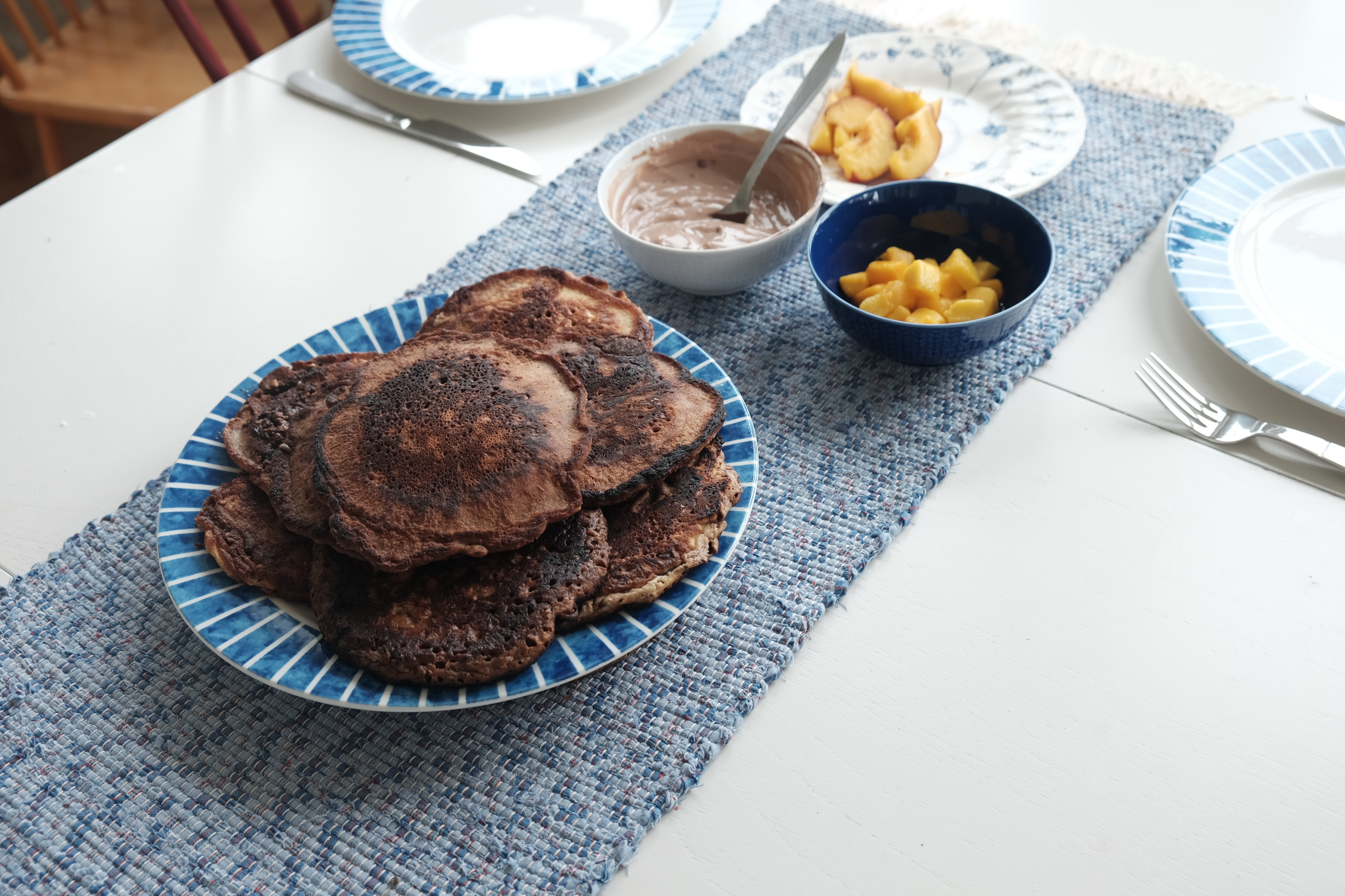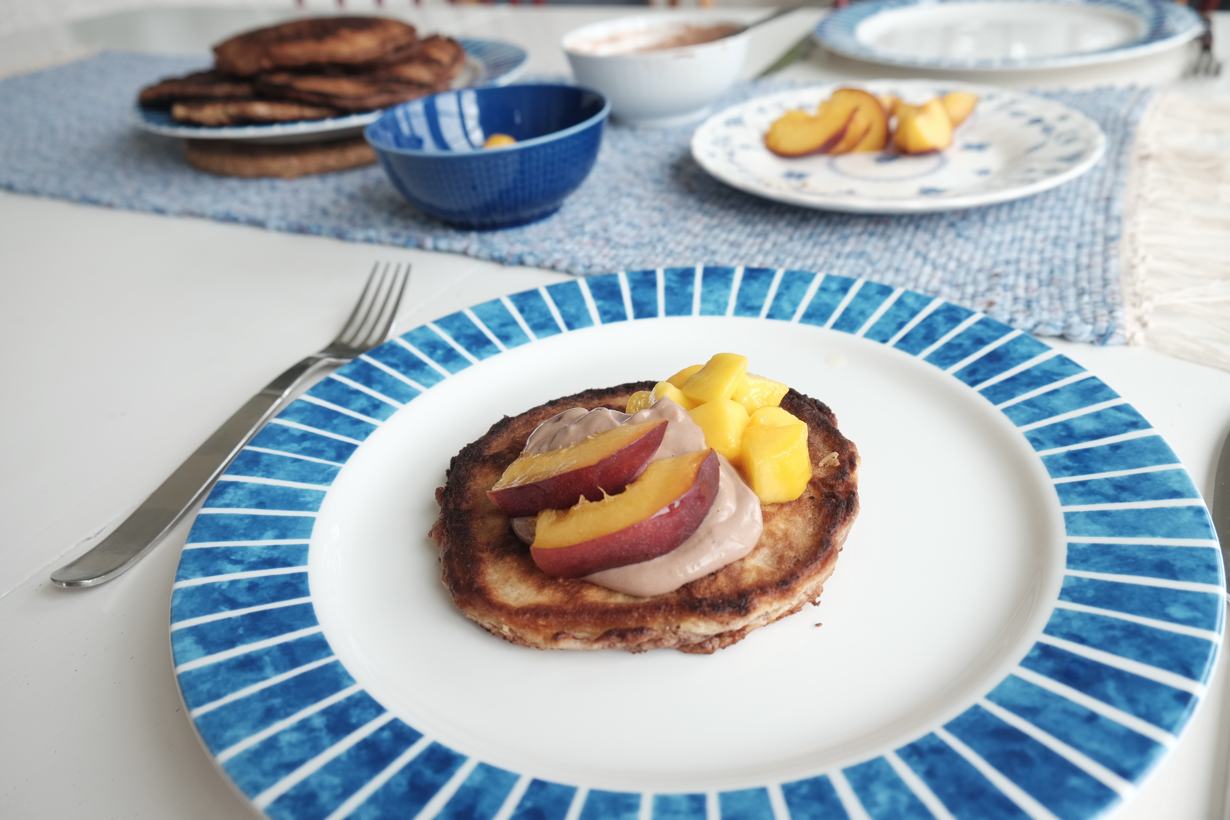 Keep the pancakes that are done warm in an oven until you are ready to serve them. I had mine with some fresh diced mango, nectarines and Greek yogurt mixed with nutella.