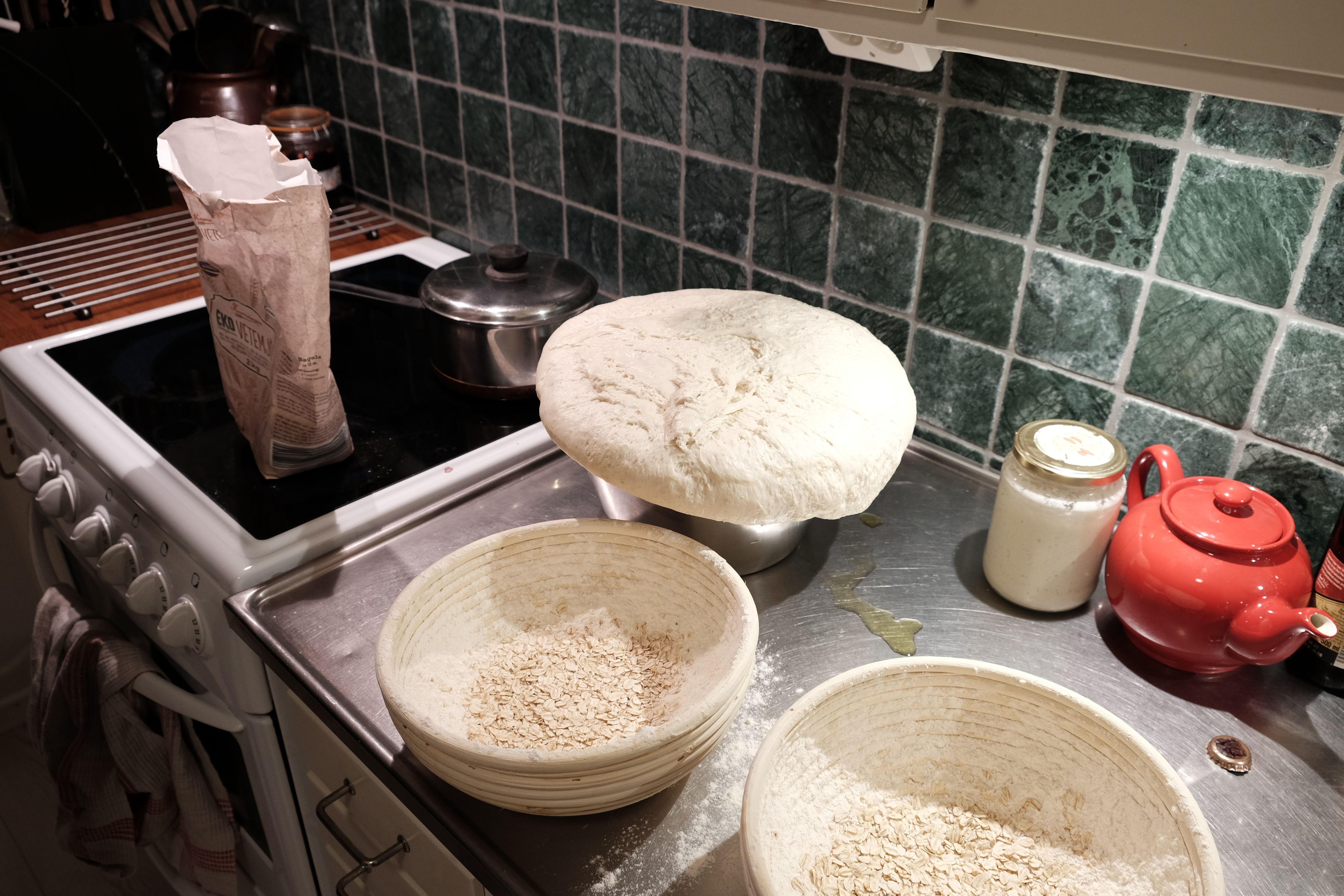 Add all of the ingredients except the salt to a stand mixer and mix on medium speed for about ten minutes. You can also knead the bread by hand but it takes a little bit more time, about 15-20 minutes. Add in the salt and mix for another 5-10 minutes until the dough is smooth and don’t stick to the mixing bowl. Transfer to a clean bowl that’s been lightly coated with olive/rapeseed oil. Leave to rise in room temperature until the dough has doubled in size and then split into two equal parts and transfer to a proofing basket. If you don’t have a proofing basket you can use two smaller bowls, just make sure to coat them with flour and/or rolled oats to make sure that the dough doesn’t stick to the bowl.