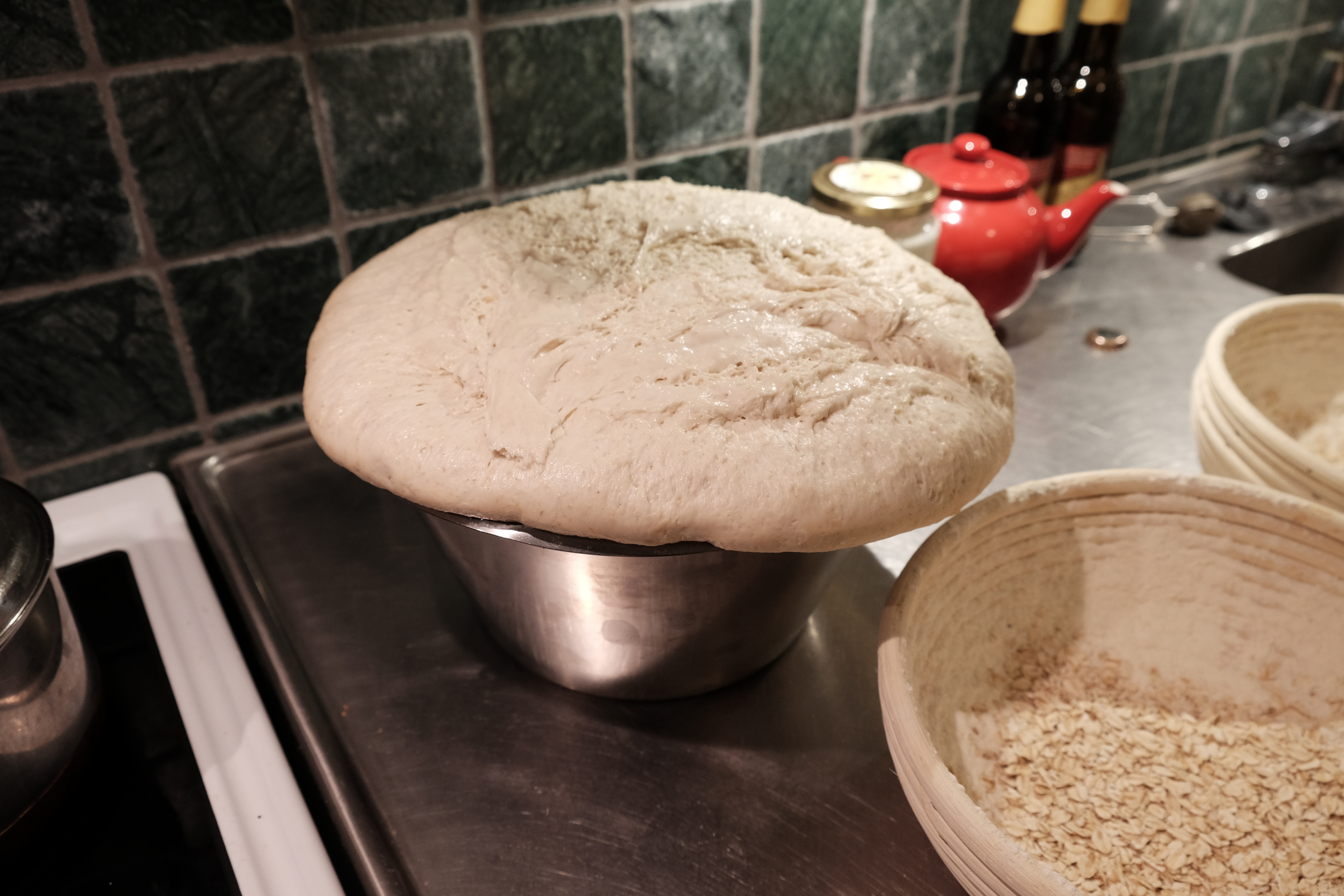 So I decided to start a sourdough and bake some bread. For my sourdough starter I just blended water and flour and then added some grated apple. This is a tip that I learned from a baker many years ago and it helps your sourdough to get started, although you could just make it with flour and water. Then I left my starter in a mason jar on the counter overnight. The next day I added some more water and flour to feed the starter and then repeated this step for the next few days. After the first day you should see bubbles forming in the starter and this means that it is working the way it should. My starter just worked a little to well so one morning when I went into the kitchen a lot of it had escaped onto the counter top. It was a little bit of a nuisance but at least it meant that my starter was very much alive and contained a lot of yeast. So I decided that this was the day I would use it to make my bread, mostly to avoid any further explosions and cleaning which, as you can see below, did not help.