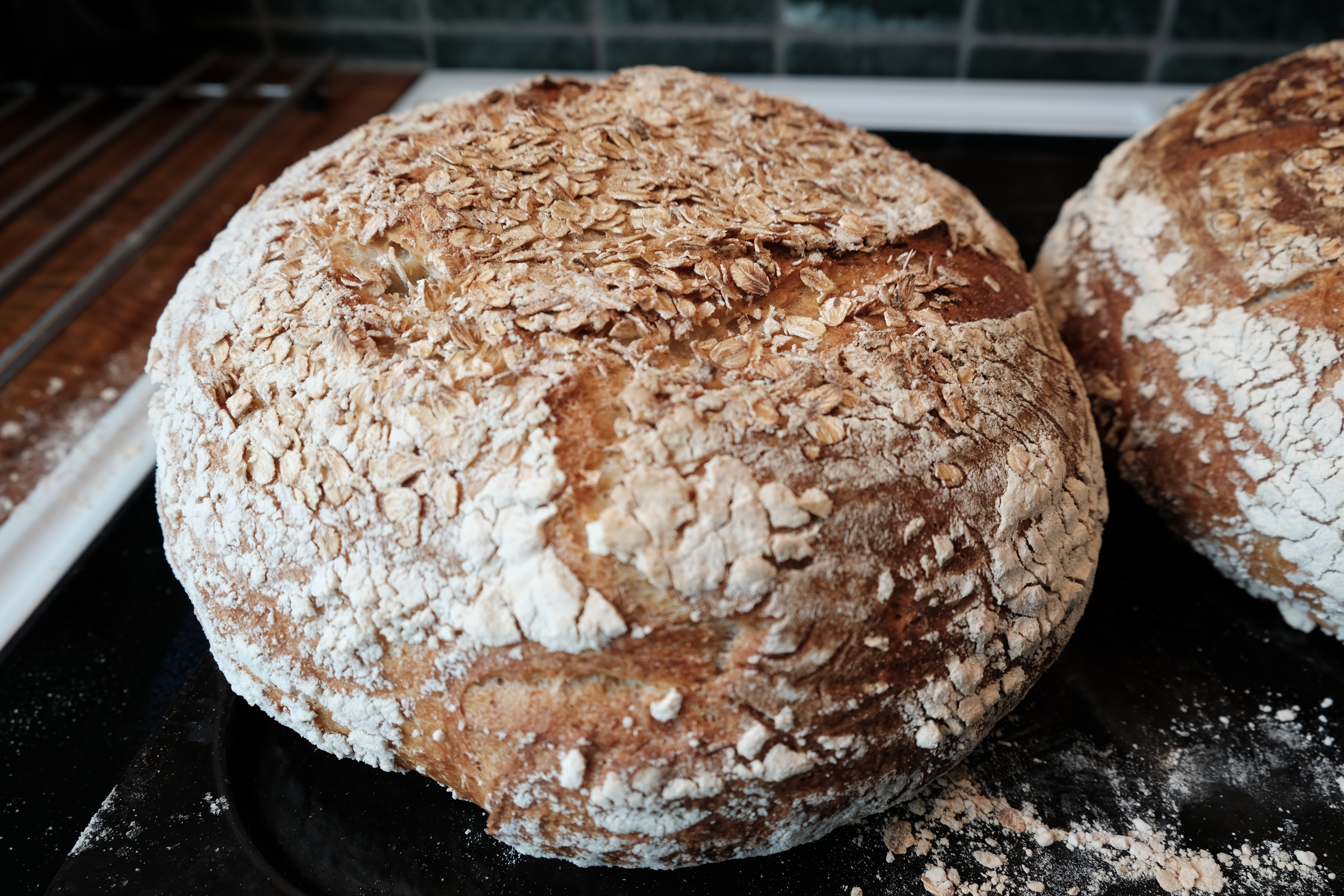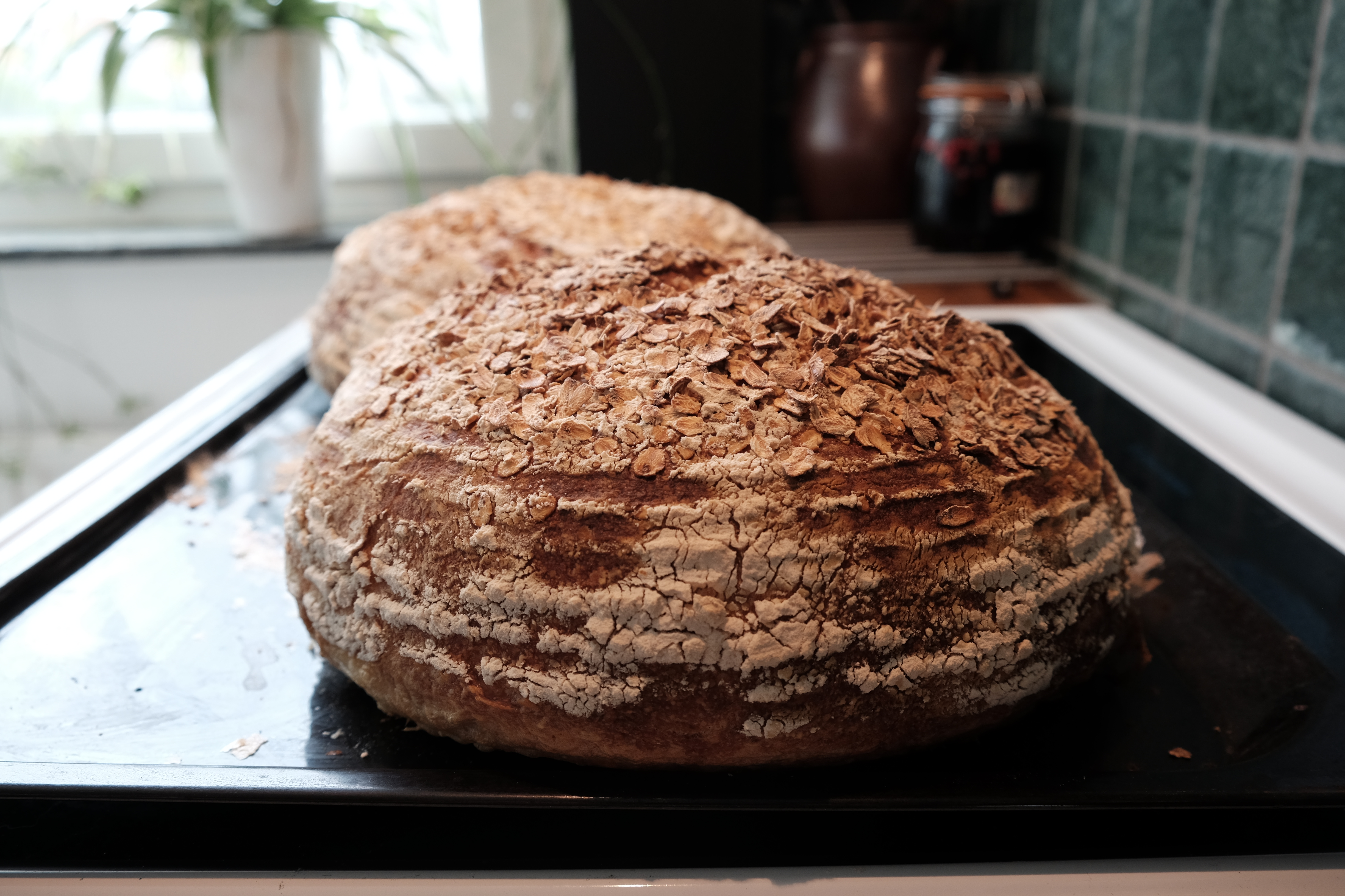 Prove the dough in your fridge overnight. In the morning: Set your oven to 250 C/482 F and put an oven tray in there to get it the same temperature as the oven. When the oven is hot, take out your tray and transfer your bread onto it (preferably without burning yourself). Bake one bread at a time (leave the other one in your fridge until it’s time to bake it). Cut a couple of shallow incisions on top of your bread with a sharp knife. Insert the tray in the bottom of your oven and spray in a little bit of water. This gives you that nice crunchy crust that you want on a sourdough bread. After 5 minutes, lower the temperature on your oven to 200 C/392 F and bake for approximately 40 minutes. If you’re unsure about if the bread is done, use a thermometer to check the temperature (it should be 98 C/208 F). Take it out of your oven and let it cool completely before you cut it. This is the hardest part because all you want to do by this point is to taste it. Repeat the steps with bread number two. This recipe takes time but it is so worth it when you take the first bite with that crunchy crust and then the soft and fluffy interior.